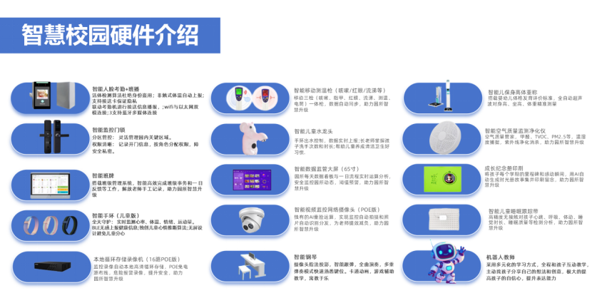 在智慧校园的建设中,硬件是感知的触角,是数据的入口和智能基础的关键。浩浩科技与摩天科技强强联合,依托顶尖香港科技大学领先的科研实力,在智能硬件、物联网、传感技术等领域,打造一站式、全园覆盖的智能硬件生态系统,致力在幼儿园、家庭内布局全面感知、互通互联、生态整合的智能硬件感知网络。
